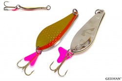 Колеблющаяся блесна German TWIN с двойным корпусом обладает повышенной уловистостью в несколько раз, по сравнению с другими искусственными приманками. Оригинальная форма лепестка, акустическое раздражение, возникающее при проводке от удара лепестков друг о друга, в совокупности с электрическим полем, образующимся при сочетании биметаллов, неотразимо действует на любого хищника.