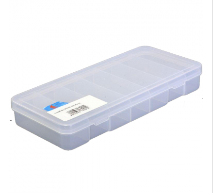Пластиковая прозрачная коробка для небольших рыболовных приманок. Изготовлена из морозостойкого и ударопрочного пластика. Коробка имеет семь отсеков размером 2,8*9 см.