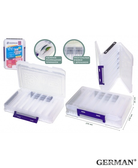 Код:GR-006964; Артикул:STRB-270-L Характеристики:Размер: 270x185x50 Описание:Серия двухсторонних коробок для хранения воблеров и других видов приманок. Коробки изготовлены из высококачественного пластика устойчивого к температурным перепадам без потери своих первоначальных свойств, формы, крепости и пластичности. Удобная форма ячеек треугольной формы с дренажем позволяет максимально комфортно и компактно разместить приманки не беспокоясь о влажности внутри коробки. Надёжный механизм запирания долговечен и исключает самопроизвольное открытие бокса при эксплуатации и транспортировке. Выпускаются в трёх типо размерах, которые позволяют подобрать габариты коробки исходя из Ваших индивидуальных потребностей и размеров размещаемых приманок.