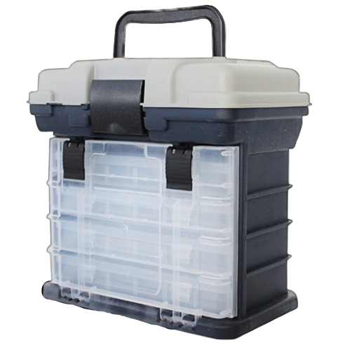 - Два укромных отдела: - Верхний отсек: глубокий, 9 см (с учетом крышки), с надежной пластиковой защелкой и возможностью крепления навесного замка. Вмещает до двух катушек размера до 3000 и мелкие аксессуары (крючки, грузила), сохраняя их в порядке. - Боковой отсек: прозрачная крышка на двух защелках для легкого доступа. Вмещает 4 специализированные коробки для приманок размером 11 см x 23 см, которые удобно размещаются на направляющих салазках. Каждая коробка имеет 3 отдела с возможностью регулировки длины, что позволяет максимально эффективно организовать ваше снаряжение.