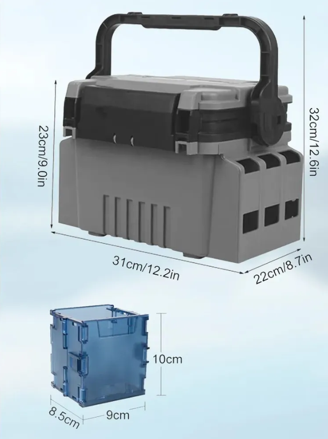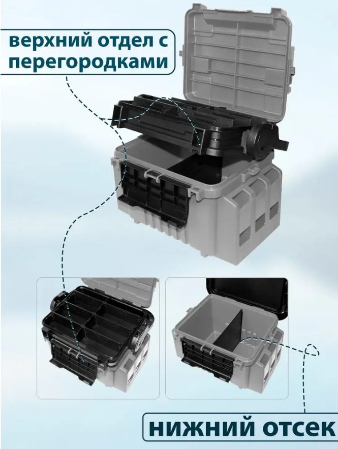 Компактный, легкий, ударопрочный ящик для рыбалки, размером 31*25*23,5 см. Удобная ручка для переноски. Оборудован специальными защёлками, которыми можно фиксировать верхнее положение ручки при переноске ящика. Подходит как для ловли с берега, так и для лодочной рыбалки. Ящик имеет два основных отделения и набор съемных перегородок, что предполагает личную настройку пространства для аксессуаров и приманок. Высота верхнего отдела 45 мм, нижнего155 мм. Количество съёмных перегородок-разделителей - 6 в верхнем и одна в нижнем отсеках. При переноске ручка фиксирует крышку, что предотвращает случайное открытие. На ручку ящика в открытом состоянии может опираться крышка, делая ее удобным столиком для приманок и наживок. В комплекте идёт держатель под стакан.