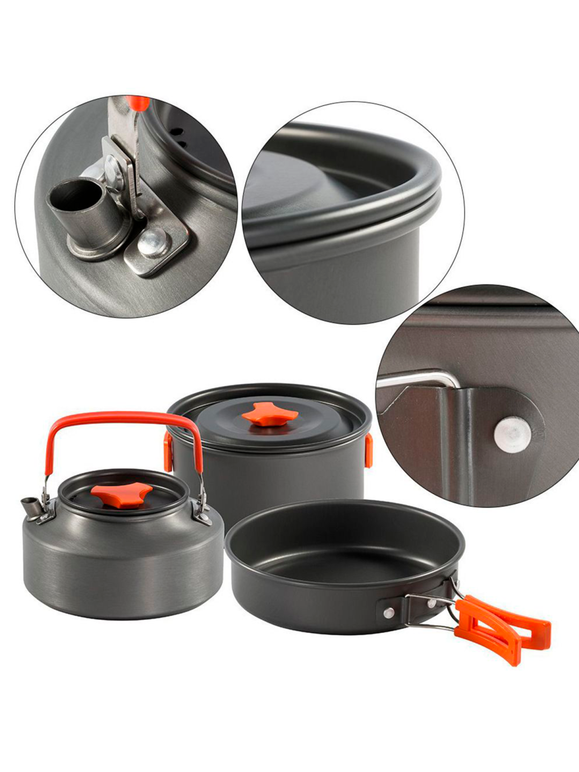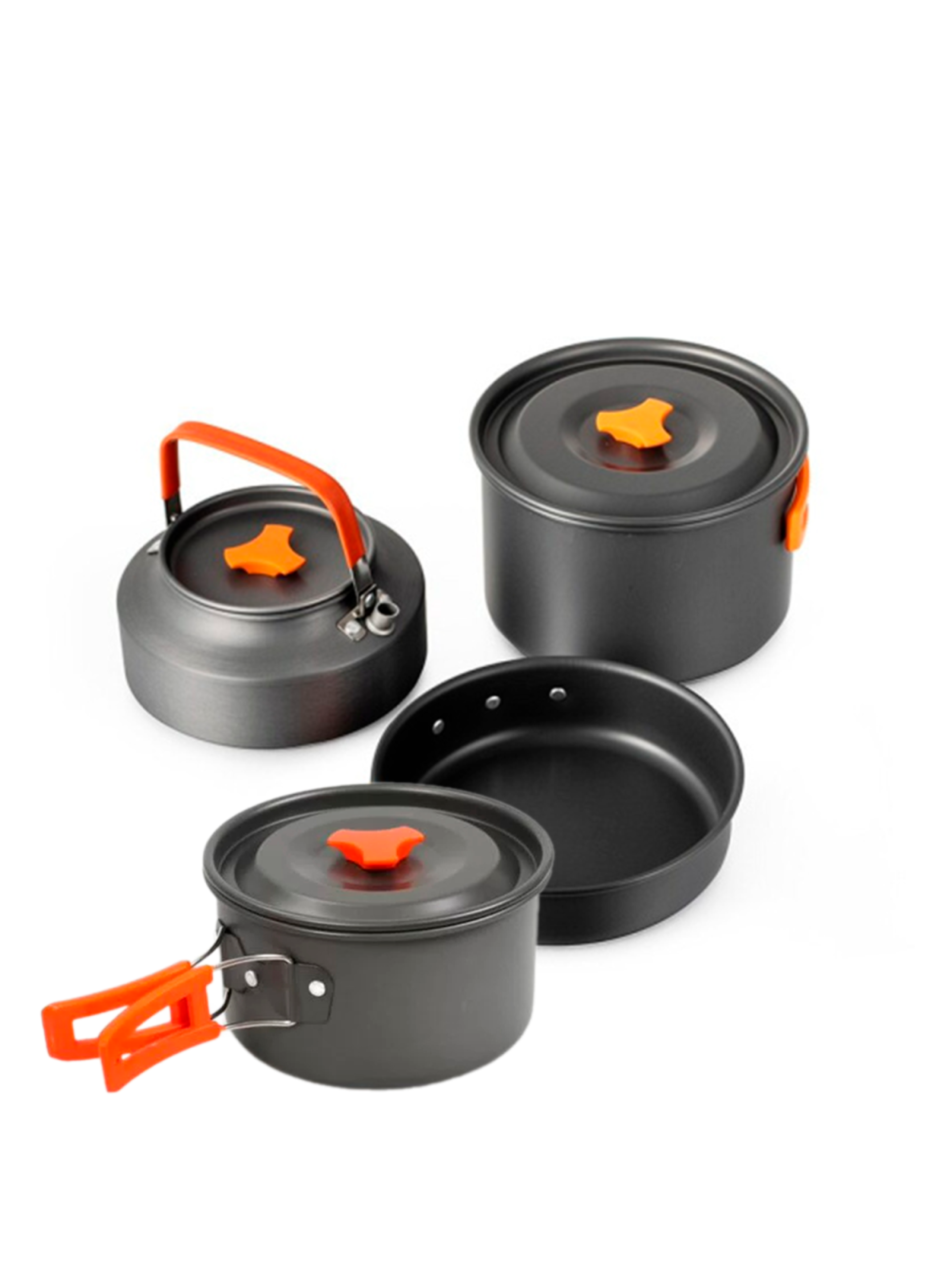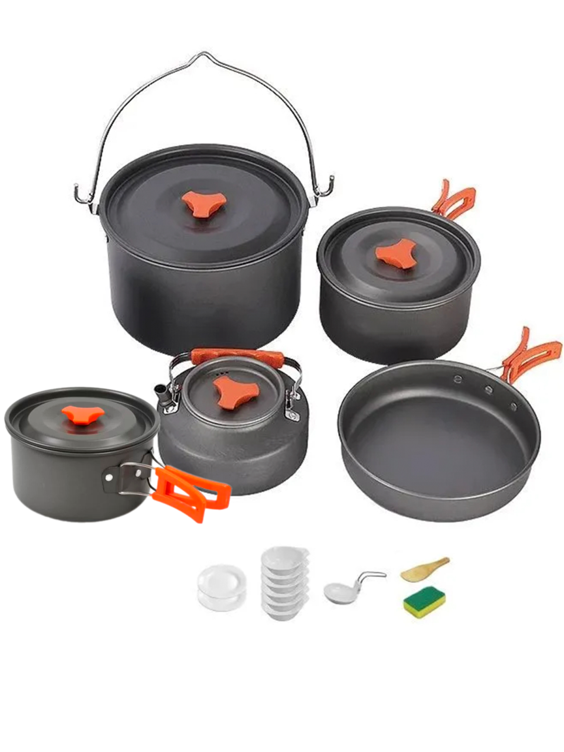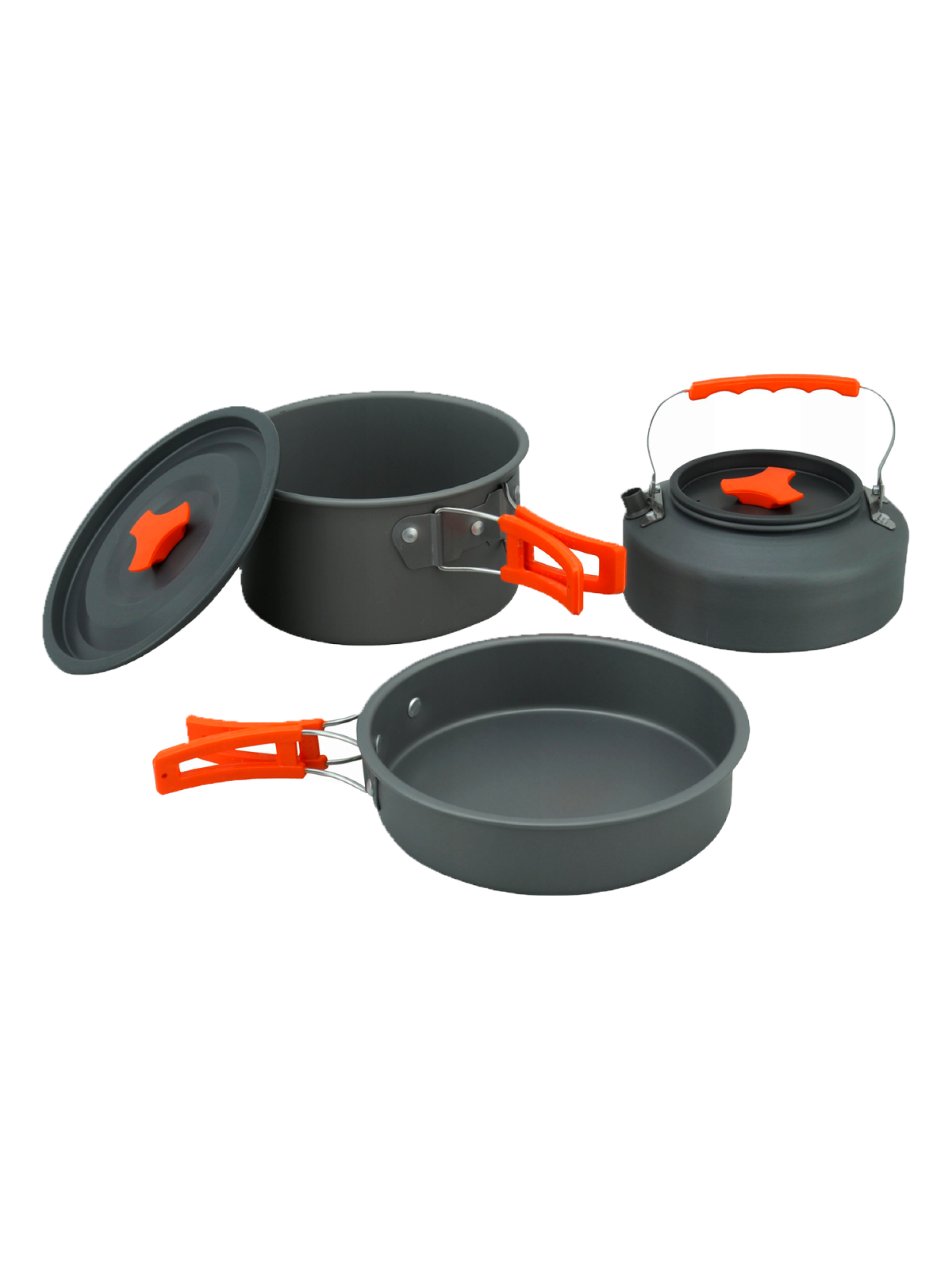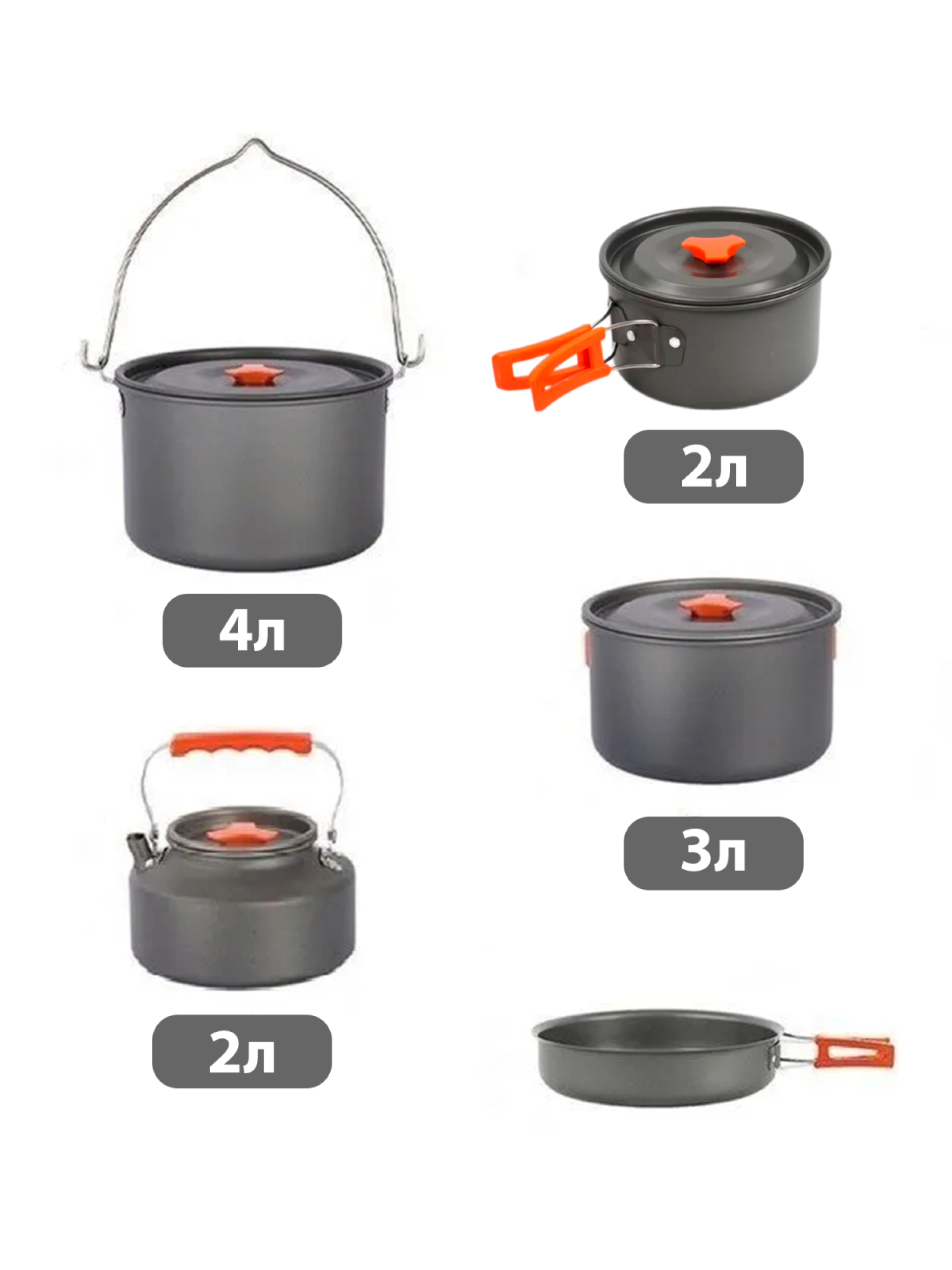 Компактный, лёгкий и удобный набор посуды. Рассчитан на шесть человек. Материал изготовления: анодированный аллюминий. Толщина стенки - 0,8 мм. Ручки имеют покрытие из термостойкого силикона. Посуда из анодированного аллюминия облядает рядом неоспоримых преймуществ: - отлично подходит для нагрева на газовых горелках; - лёгкая; - доступная цена; - не боится кислот, устойчива к внешним воздействиям; - снижает риск пригорания пищи во время приготовления. Состоит: - котелок -4л.; - кастрюля большая - 3л.; - кастрюля малая - 1,5л.; - сковорода - 1,2л.; - чайник - 0,8л.; - две тарелки; - шесть чашек по 250 мл.; - поварёжка складная; - лопатка деревянная; - губка для мытья посуды; - мешок с утяжкой для хранения и транспортировки.