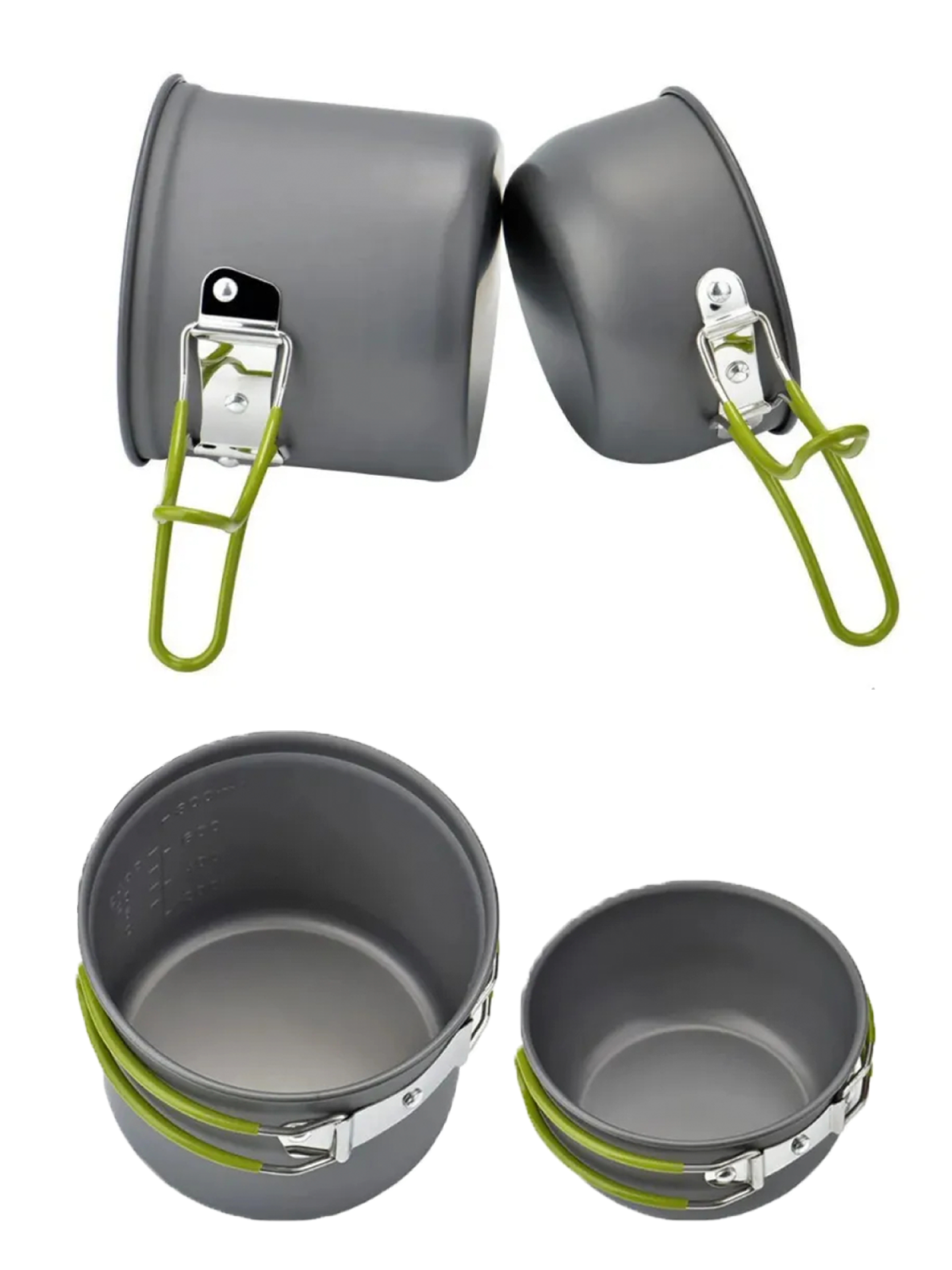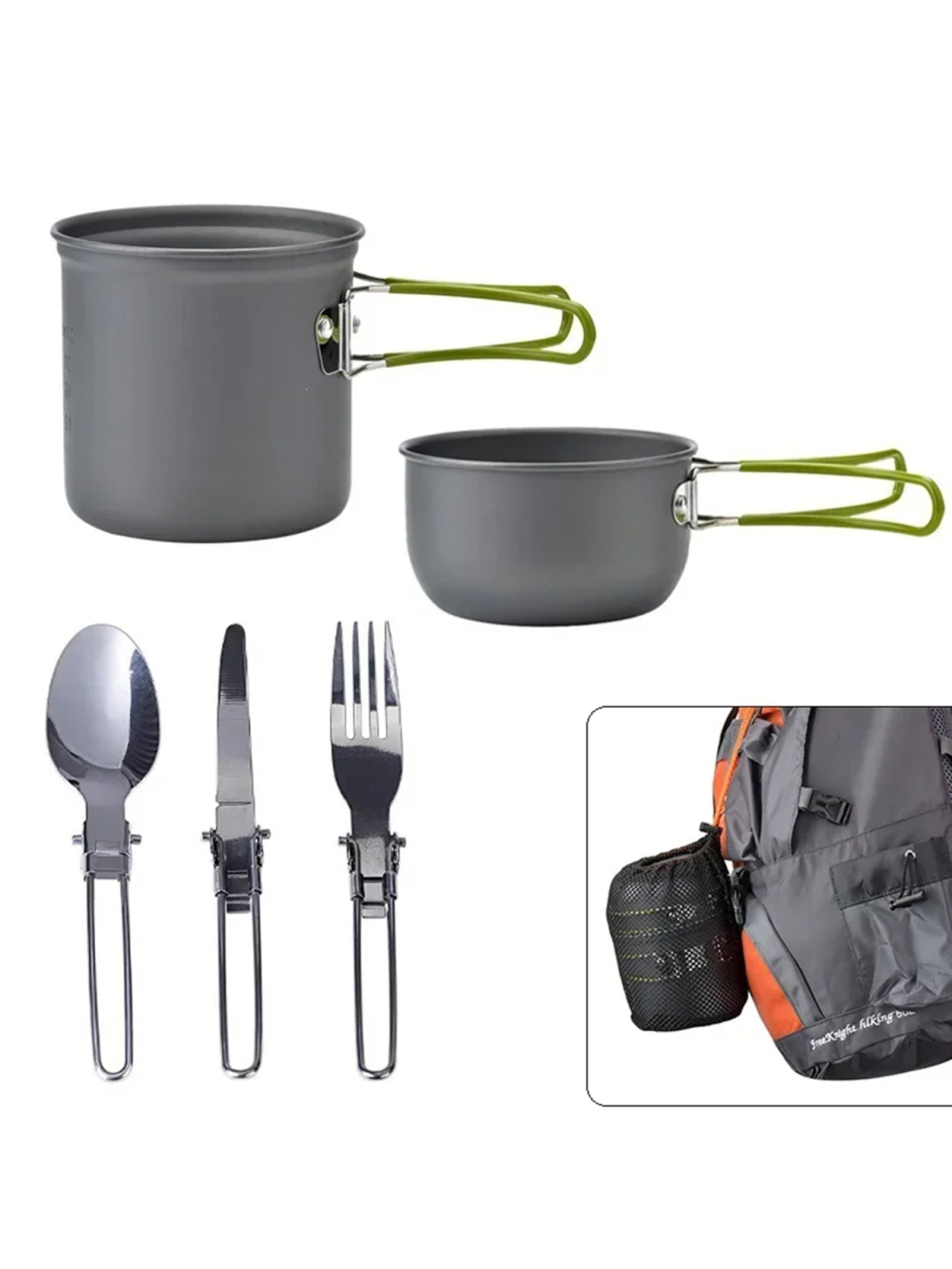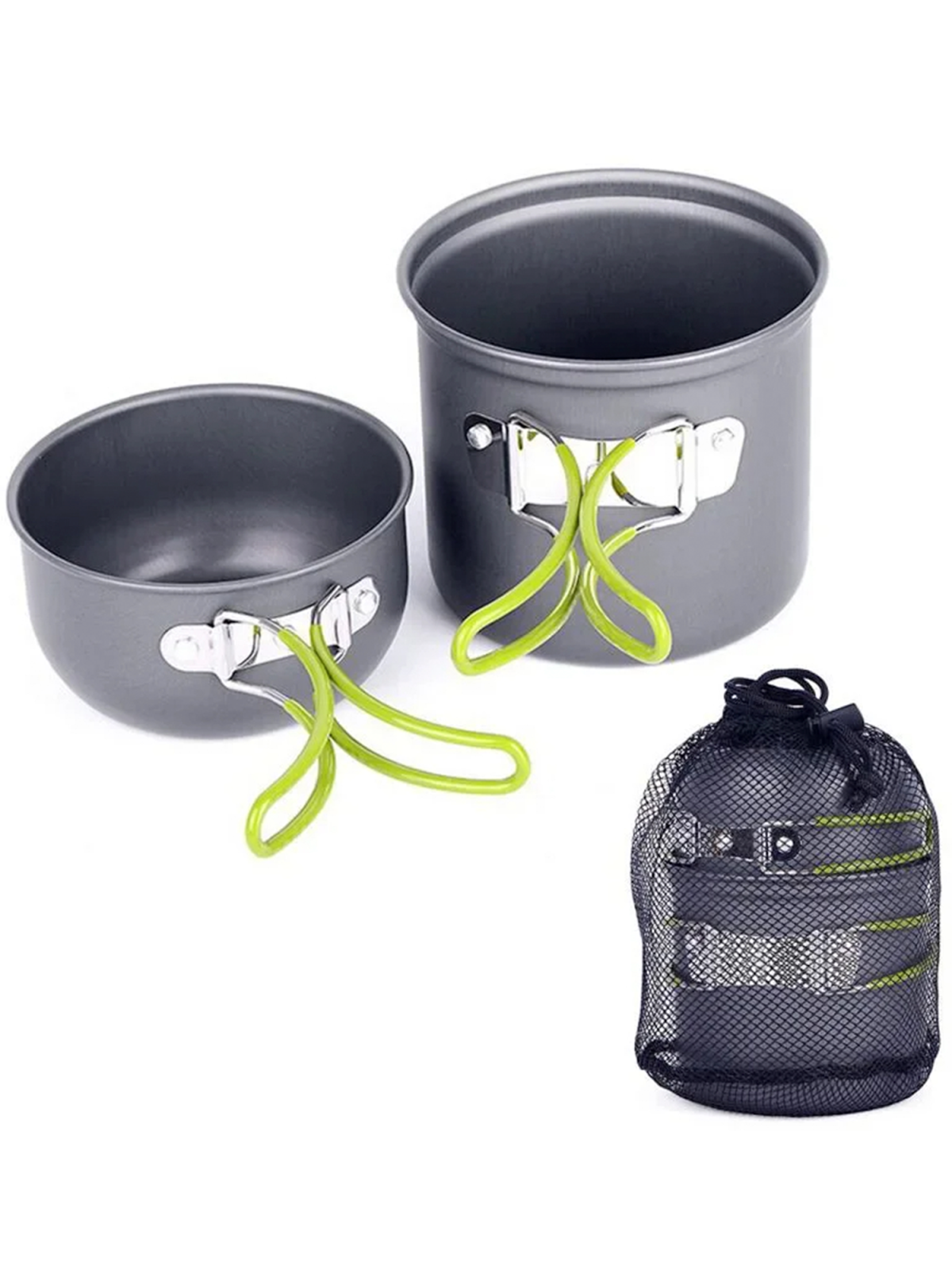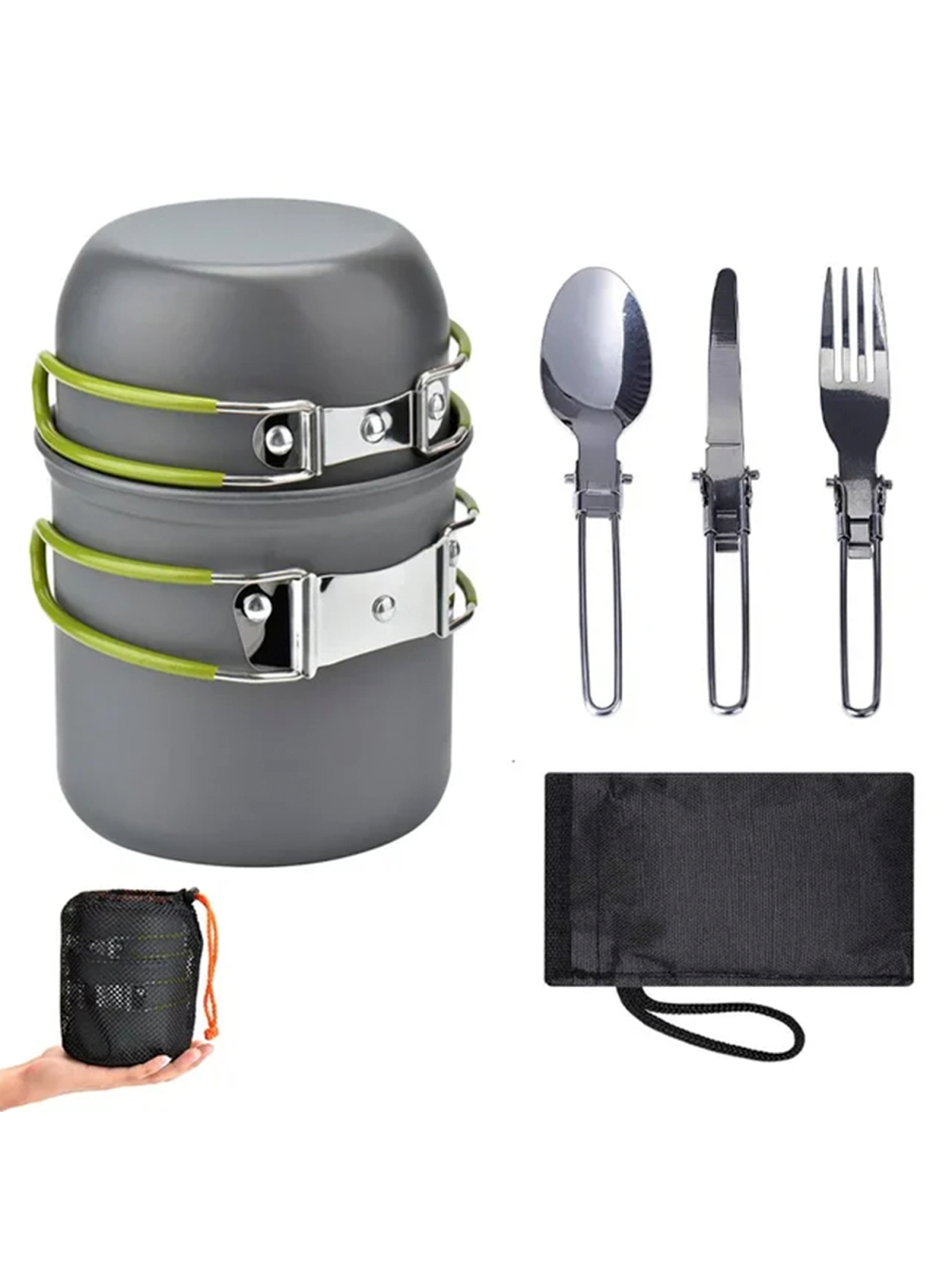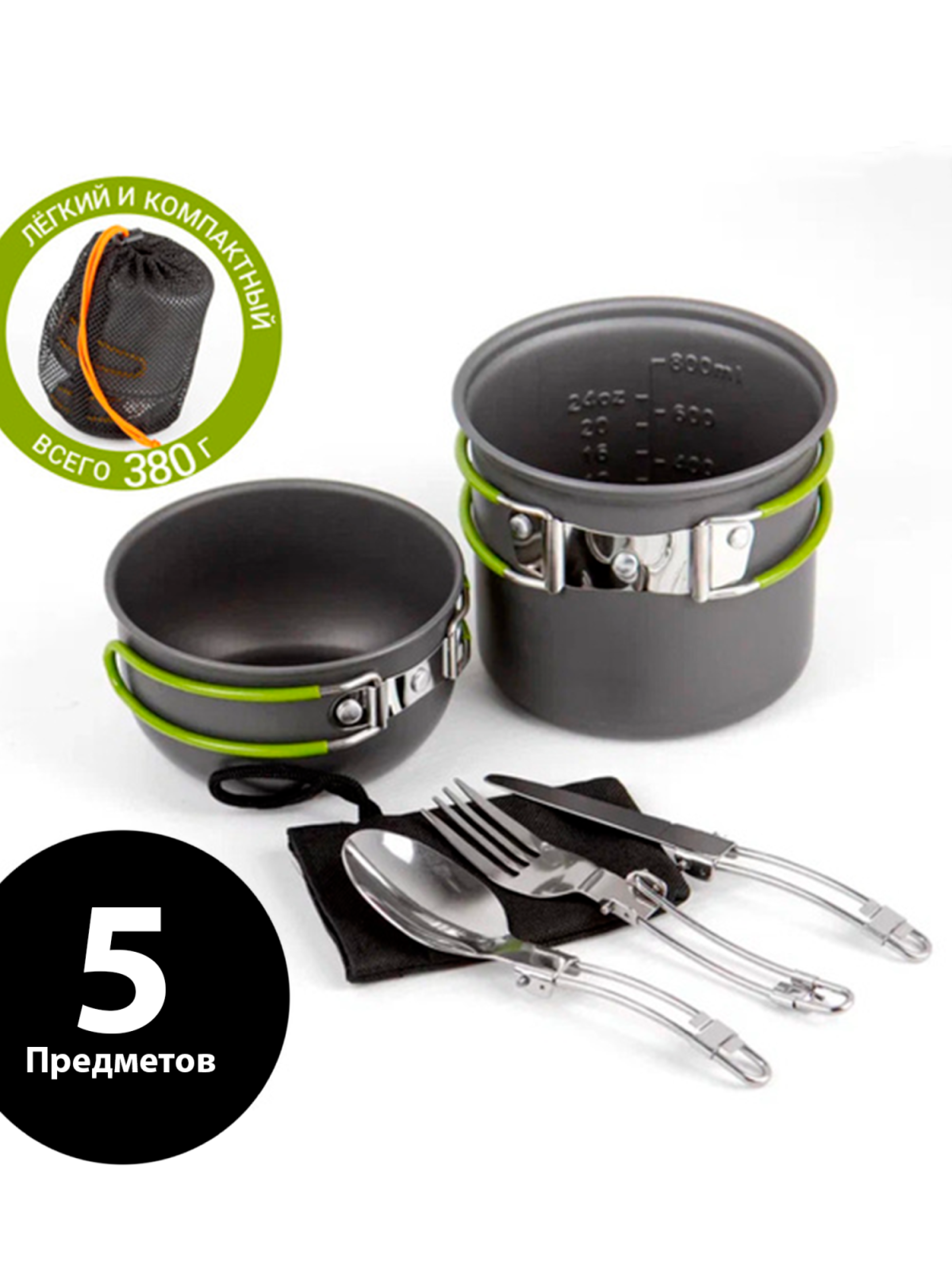 Минималистичный, компактный, лёгкий и удобный набор посуды. Рассчитан на одного человека. Материал изготовления: анодированный аллюминий. Толщина стенки - 0,8 мм. Ручки имеют покрытие из термостойкого силикона. Посуда из анодированного аллюминия облядает рядом неоспоримых преймуществ: - отлично подходит для нагрева на газовых горелках; - лёгкая; - доступная цена; - не боится кислот, устойчива к внешним воздействиям; - снижает риск пригорания пищи во время приготовления. Состоит: - кастрюля объёмом 1000 мл.; - чашка объёмом 400 мл.: - набор столовых принадлежностей - вилка, ложка, нож; - сетчатый мешок для хранения.