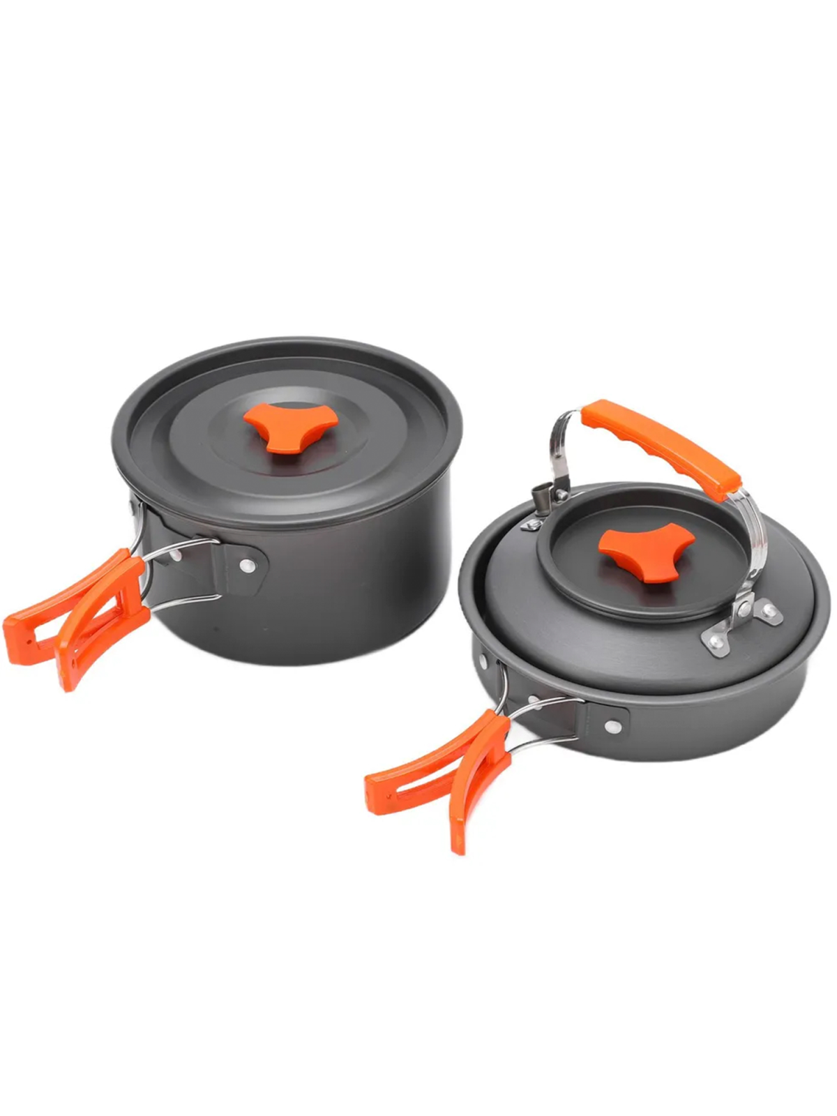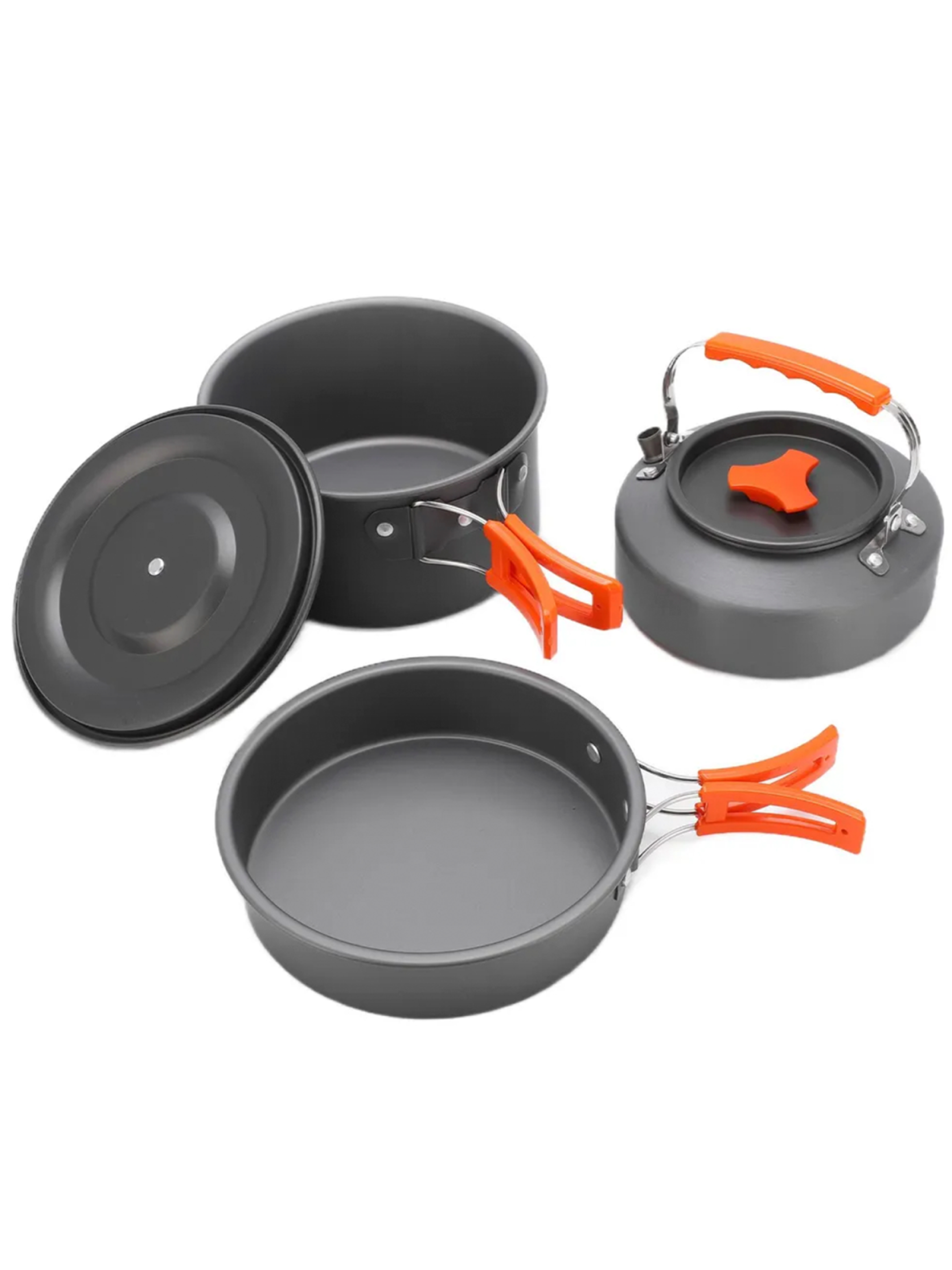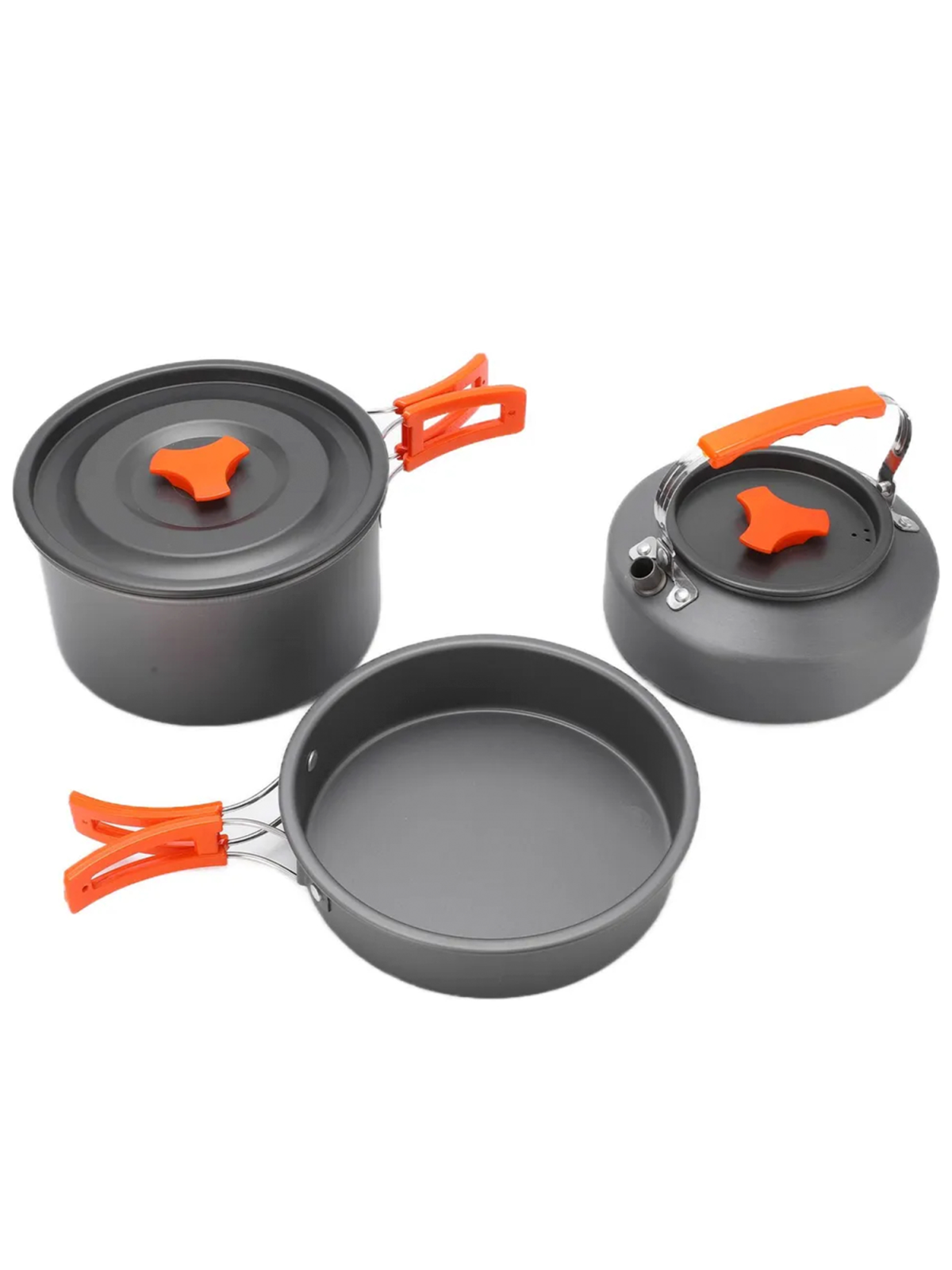 Компактный, лёгкий и удобный набор посуды. Рассчитан на трёх человек. Материал изготовления: анодированный аллюминий. Толщина стенки - 0,8 мм. Ручки имеют покрытие из термостойкого силикона. Посуда из анодированного аллюминия облядает рядом неоспоримых преймуществ: - отлично подходит для нагрева на газовых горелках; - лёгкая; - доступная цена; - не боится кислот, устойчива к внешним воздействиям; - снижает риск пригорания пищи во время приготовления. Состоит: - кастрюля объёмом 1800 мл.; - сковорода объёмом 900 мл.: - чайник с крышкой объёмом 1000 мл; - крышка для кастрюли/сковороды; - 3 пиалы; - поварёжка пластиковая складная; - лопатка деревянная; - губка для мытья посуды; - мешок для хранения.