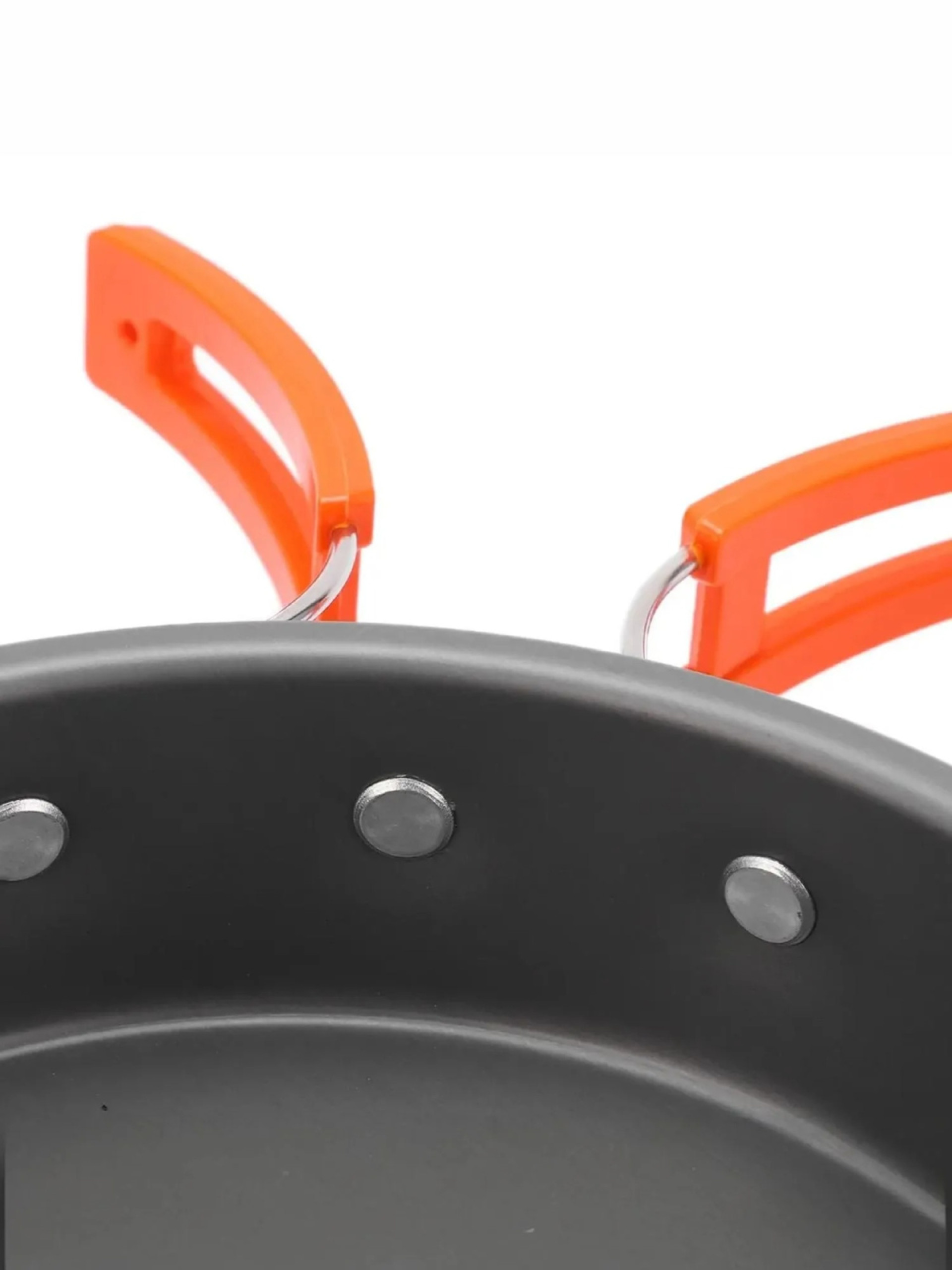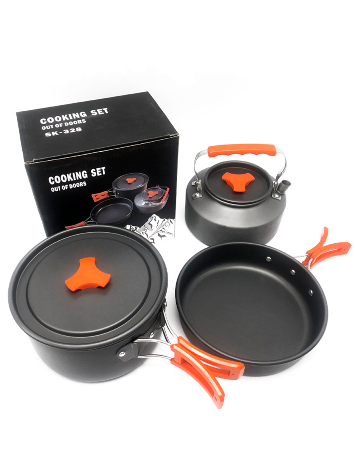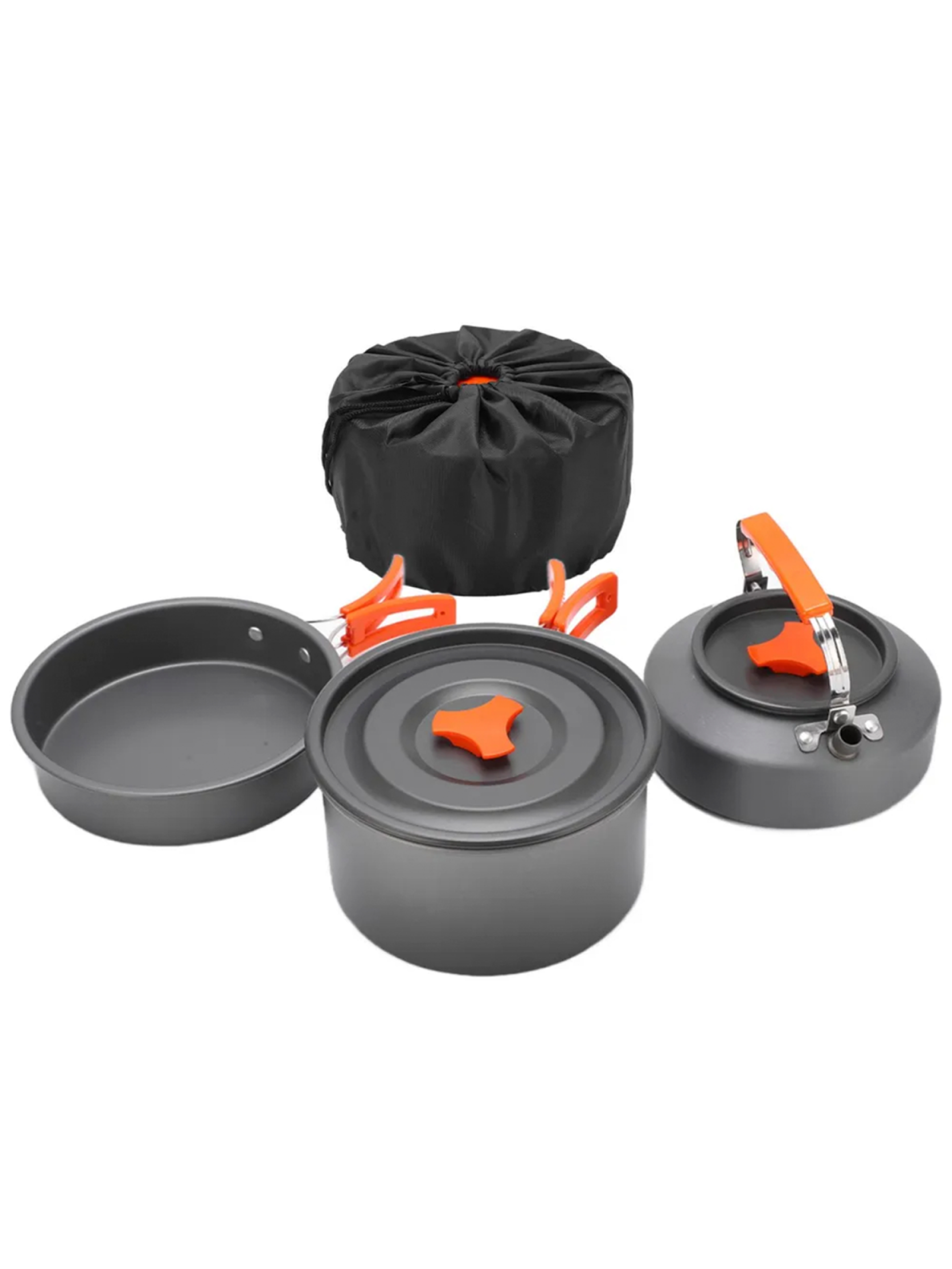 Компактный, лёгкий и удобный набор посуды. Рассчитан на трёх человек. Материал изготовления: анодированный аллюминий. Толщина стенки - 0,8 мм. Ручки имеют покрытие из термостойкого силикона. Посуда из анодированного аллюминия облядает рядом неоспоримых преймуществ: - отлично подходит для нагрева на газовых горелках; - лёгкая; - доступная цена; - не боится кислот, устойчива к внешним воздействиям; - снижает риск пригорания пищи во время приготовления. Состоит: - кастрюля объёмом 1800 мл.; - сковорода объёмом 900 мл.: - чайник с крышкой объёмом 1000 мл; - крышка для кастрюли/сковороды; - 3 пиалы; - поварёжка пластиковая складная; - лопатка деревянная; - губка для мытья посуды; - мешок для хранения.