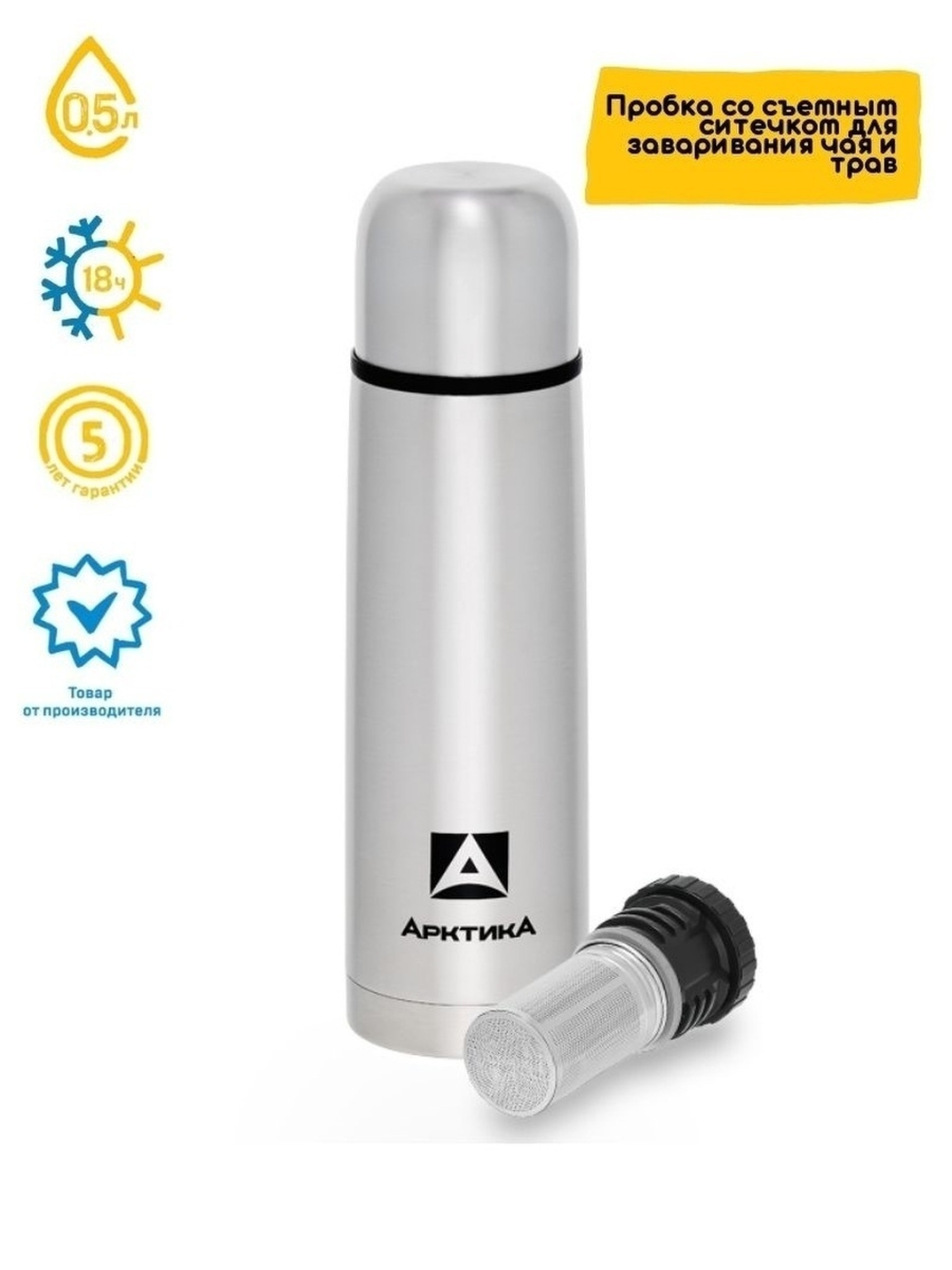 Емкость 0.5 л Сохранение температуры 18 ч Материал корпуса нержавеющая сталь Материал колбы нержавеющая сталь Диаметр горлышка 4.5 см Наличие ручки нет Материал ручки нет Подходит для посудомоечных машин нет Ситечко для заварки
